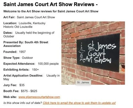 Our basic “Website Listings” package offers your art fair great exposure on CallsForArtists.com (to attract artist applications), and on ArtFairCalendar.com (to attract art shoppers), and on ArtShowReviews.com where artists review and rate your show.